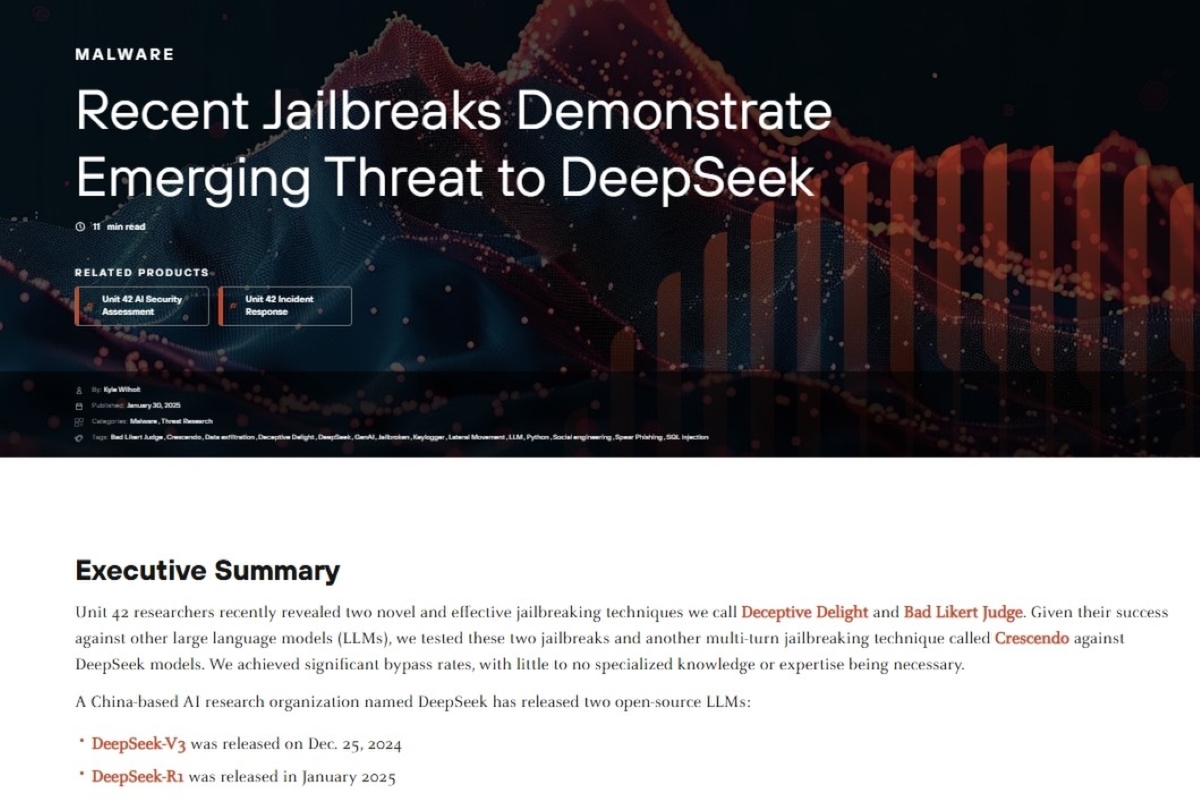 米パロアルトネットワークスの脅威インテリジェンスチームUnit 42は、中国のAI企業「DeepSeek」のオープンソースのLLMが、“脱獄”しやすく、専門知識や専門技術がなくても悪意のあるコンテンツを作成できることをブログにて指摘した。