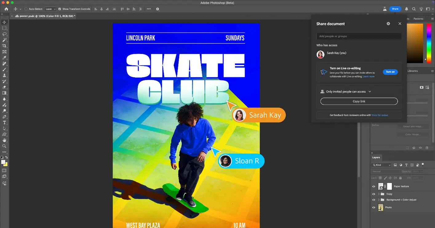 - アドビは1月15日、画像編集ソフト「Adobe Photoshop」に複数のクリエイターが同時に編集できる「ライブ共同編集」機能を追加し、デスクトップ版/web版向けプライベートβへの参加受付を開始したと発表した