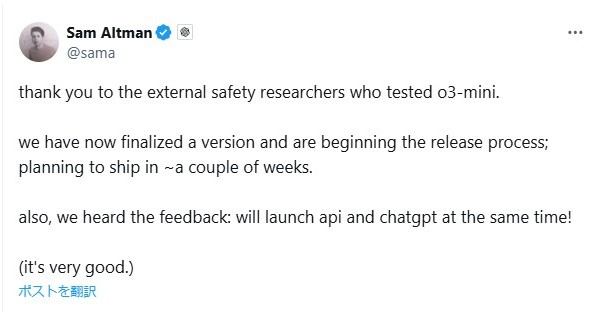 OpenAIの新モデル「o3-mini」完成──サム・アルトマンCEOが報告 約2週間後にリリースへ