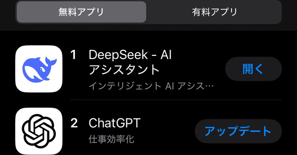 中華AI「DeepSeek」、日本のApp Store無料アプリランキングでも1位に ChatGPT抑える