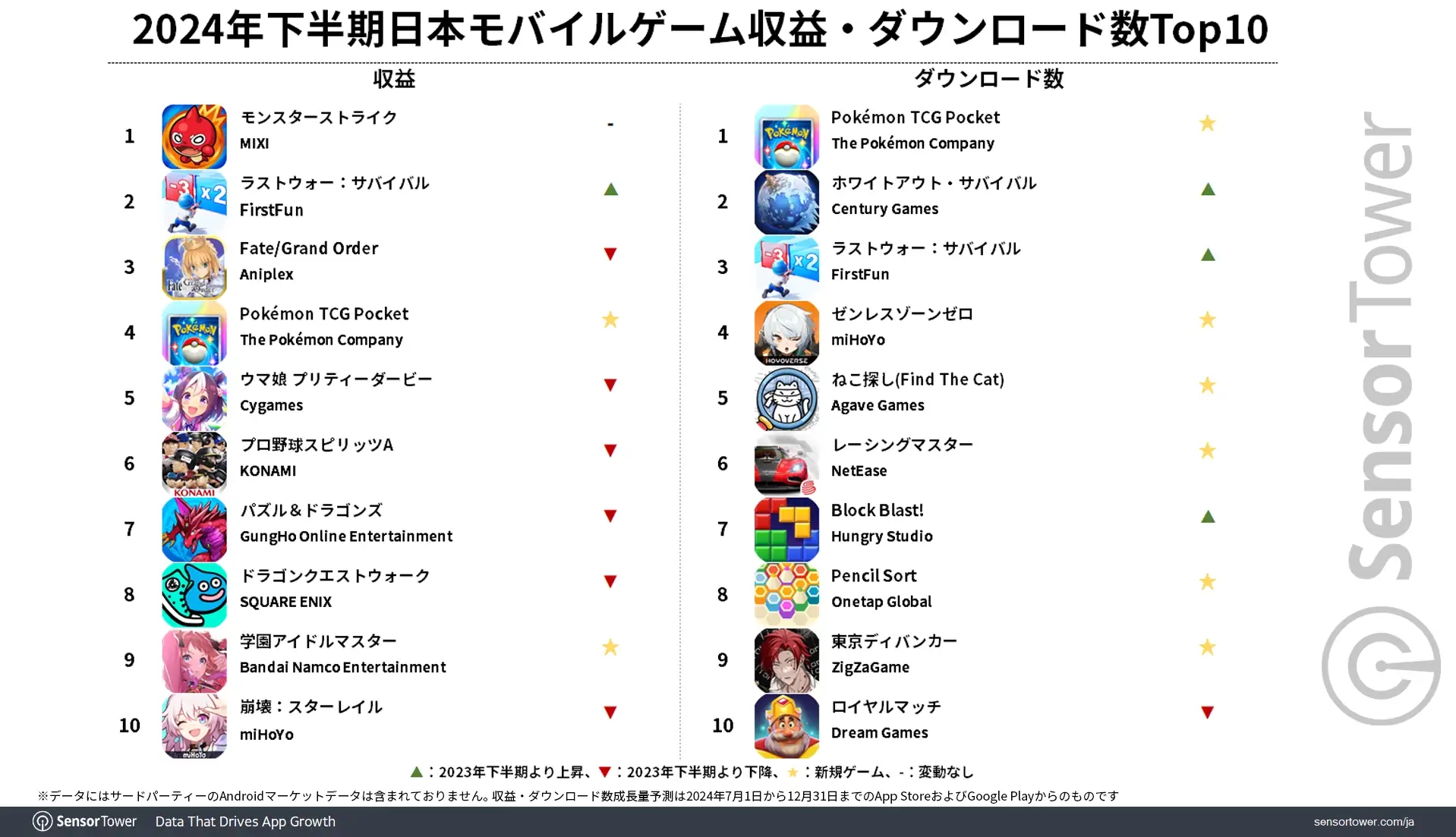 Sensor Tower,2024年下半期の国内モバイルゲーム市場の分析レポートを公開。「ポケポケ」と「ラストウォー:サバイバル」の成長が目立つ