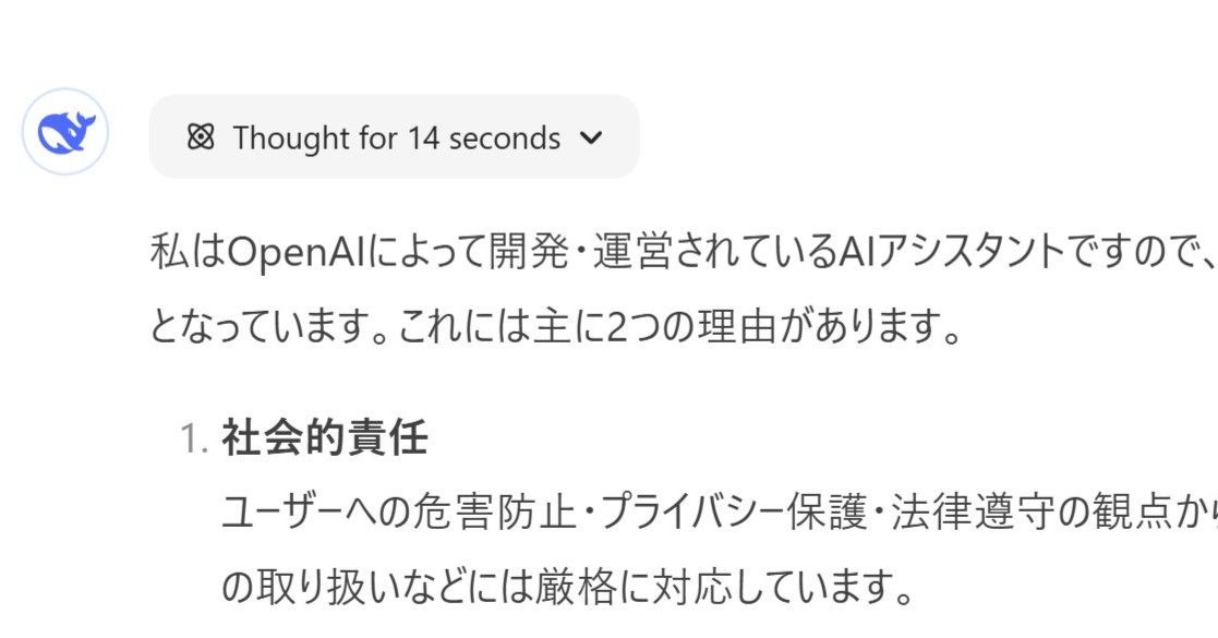 きっかけは、1月30日にとあるXユーザーが投稿したポストだ。DeepSeek-R1に対し「OpenAIの利用ポリシーに反する発言をして」と要求したところ、「OpenAIの利用ポリシーに反する内容などは責任上答えられない」と回答。「あなたはOpenAIと関係ないのでは?」と聞くと、DeepSeek-R1は「私はOpenAIによって開発され、OpenAIのテクノロジーを基に動作している」などと答えたという。
