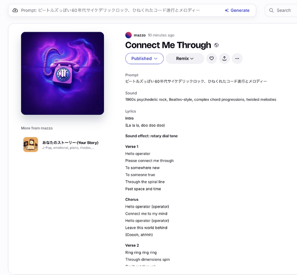これがいきなりなかなかの出来。プロンプトに日本語も使えて日本語歌詞の楽曲も生成できて、品質も高いのです。品質で言えばSunoやUdioを一部凌駕しているかもしれません。