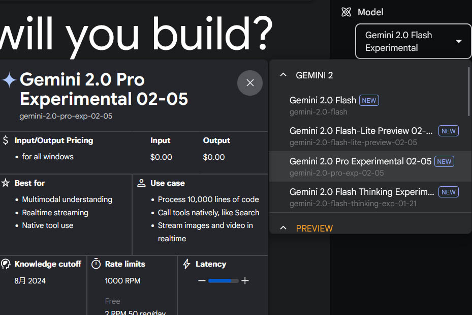 また、コーディング性能と複雑なプロンプトに適した「Gemini 2.0 Pro」の試験運用版も公開。Google AI StudioとVertex AIのほか、Gemini Advanced(月額2,900円)ユーザー向けのGeminiアプリでも利用できる。