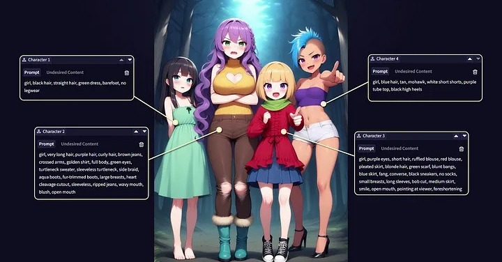 2025年3月1日、米Anlatanが「NovelAI Diffusion V4 Full」を正式にリリースしました。この新モデルは、最大6人のキャラクターを同時に生成できる「マルチキャラクタープロンプト」機能を搭載しており、キャラクター同士の位置を指定して構図を細かく制御することが可能です。また、自然言語でのプロンプト入力にも対応しており、ユーザーはキャラクターの動作を指示するための「アクションタグ」機能を利用できます。