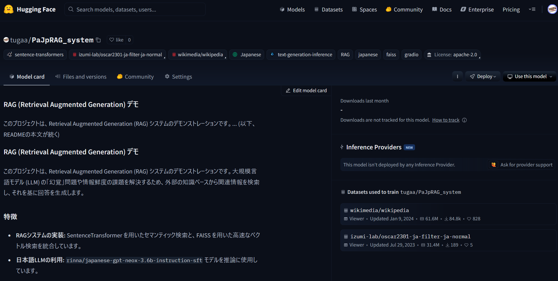 Hugging Faceのモデル:https://huggingface.co/tugaa/PaJpRAG_system